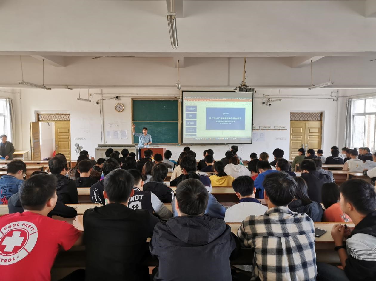 讲座伊始,主讲人张永亮老师先向大家讲解了IT产业的最新趋势,他说:“新的时代产生新的机遇,因此需要新的英雄。”张老师还阐述了5iABC(5G.iOT.AI.BigDate.Cloud)概念,由此引出未来将由人工智能升级产业的灵魂。讲座中,张老师列举了数据智能技术的应用领域,如工业制造、农业生产、互联网服务等多个热门行业,同时用PPT的形式生动形象的为大家展示了ABC产业应用闭环。最后,张老师强调:所有同学在就业之前一定要事先做好规划,坚持点滴积累,坚持学好专业,有坚持才有积累,努力成为新IT时代需要的五维型技术人才。