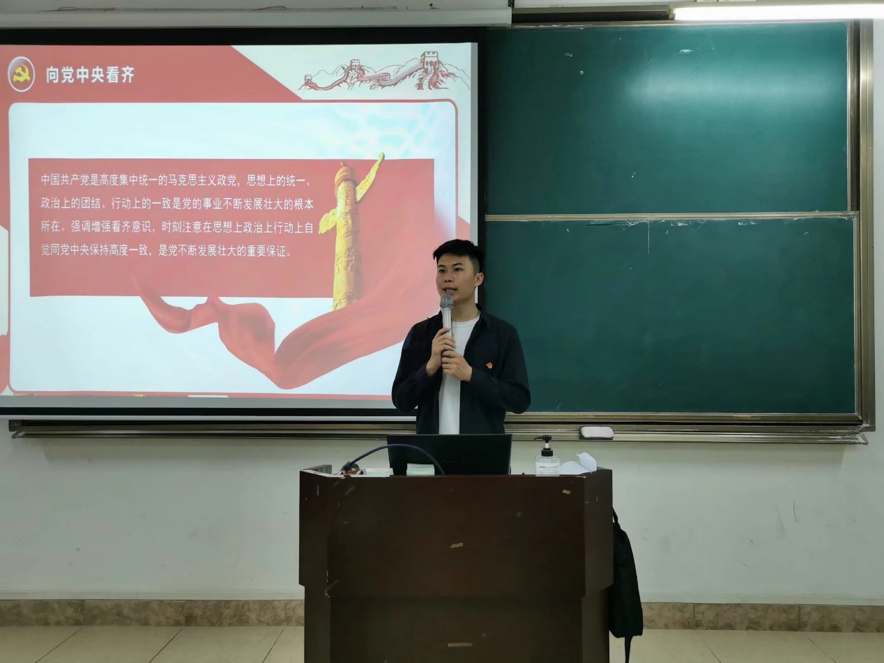 在课上,陈世琪老师先为大家讲解了学习党史对一名青年学生的重要性。而后,陈世琪老师从建党初期开始到如今党经历过的风风雨雨开始讲起,让大家清楚地认识到党为建设新中国付出的不懈努力,从而解释了“什么时候都得讲政治”、“坚持以大局为重”、“领导核心至关重要”、“向党中央看齐”这四个党史视角下的重要思想。最后,陈世琪老师指出,要坚决拥护党的核心领导,并把党史教育和党的方针政策融会贯通,学习党史并非只是浮于表面,而是要让大家对党的认识有一个质的升华。至此,党史学习交流课顺利结束。