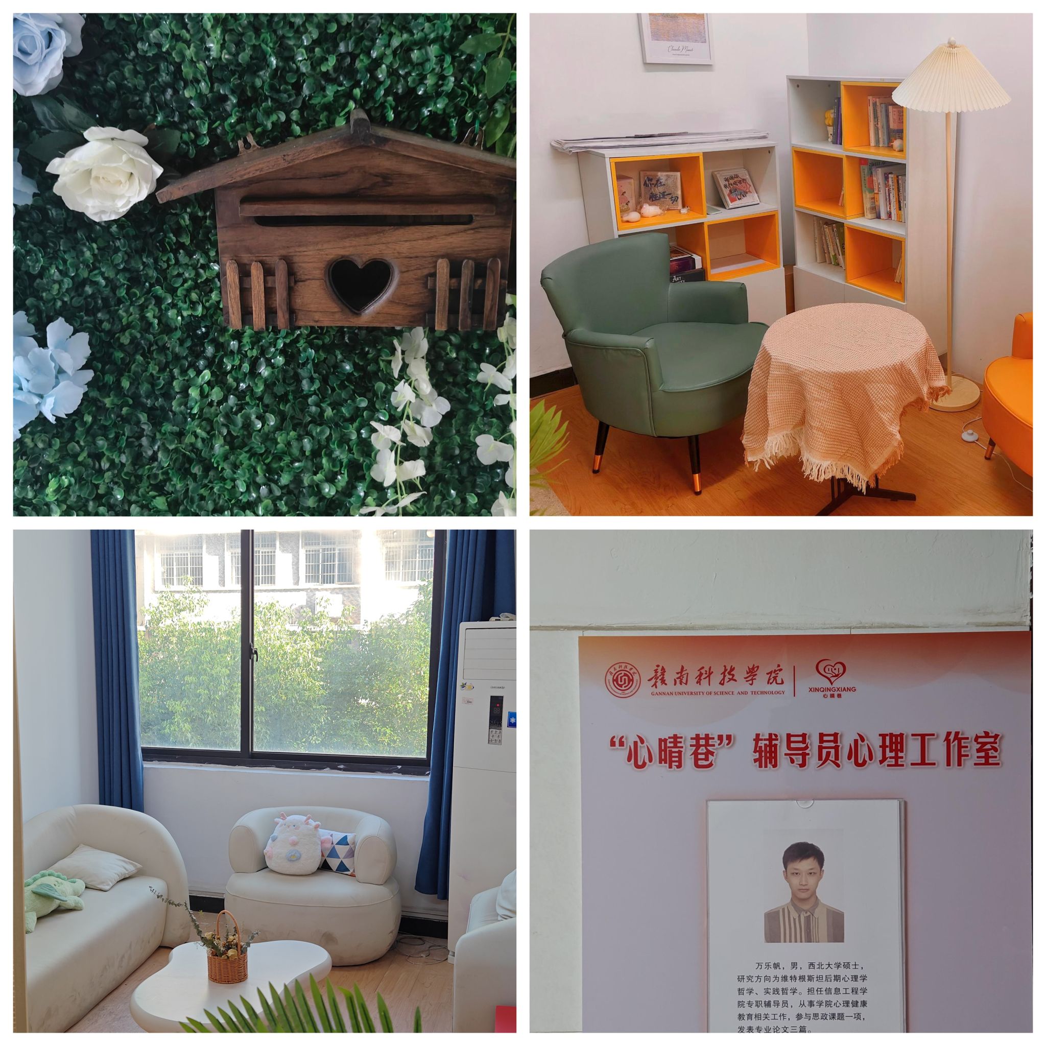 心理咨询室设立两个分区,解压治愈区和谈心谈话区。解压治愈区配备柔软舒适的抱枕、解压玩偶及精选治愈系书籍,为学生们提供一个宁静角落放松身心、舒缓压力。谈心谈话区设立温馨私密的隔音空间,配备舒适座椅与绿植,是学生与心理老师进行深度交流、倾诉心声的安全场所。