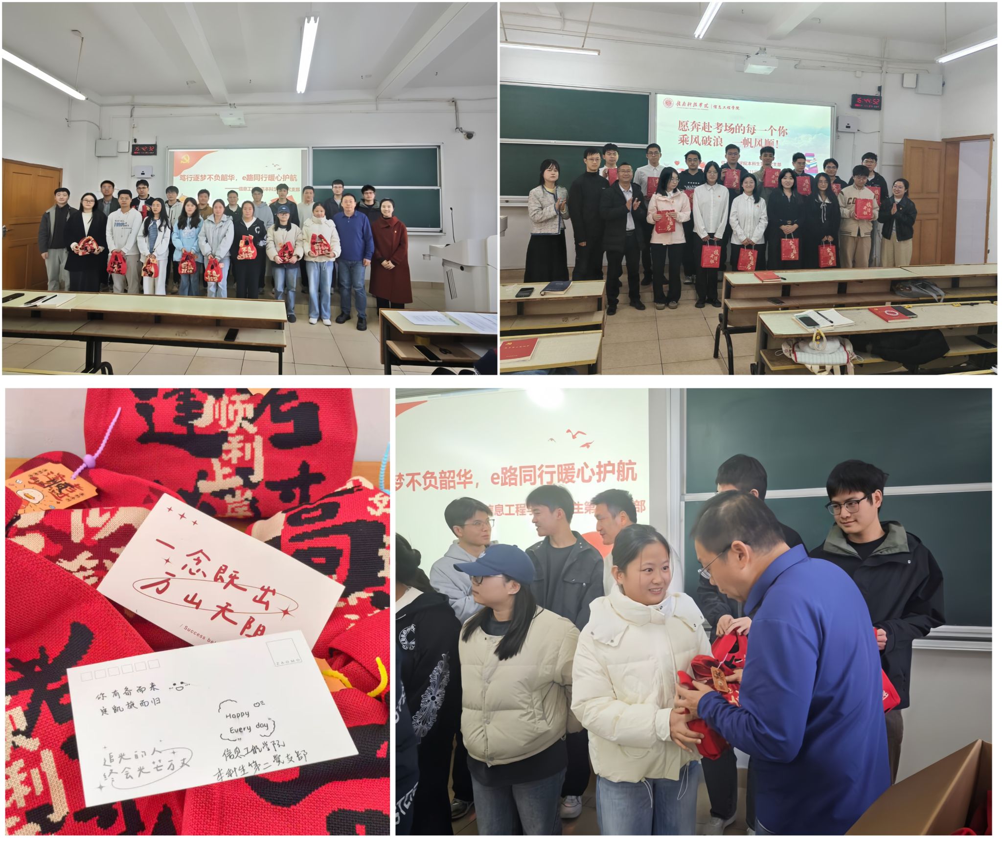 党组织的关怀,是学子们最坚实的后盾。本科生第二党支部开展“笃行逐梦不负韶华,e路同行暖心护航”助力活动,学院党委副书记邓小鸿殷殷叮嘱,让大家在拼搏之余不忘兼顾身心。精心准备的“备考加油包”,将党组织的牵挂与支持,化作学子手中沉甸甸的力量。本科生第一党支部以“e路先锋燃斗志,研考公考赴新程”为主题,党支部书记李曼如与学子们共同回顾奋斗历程,一份份满载寓意的“加油礼包”,不仅是物质的支持,更是精神的鼓舞。“乘风破浪,一帆风顺”的嘹亮口号,展现了青春昂扬的斗志。