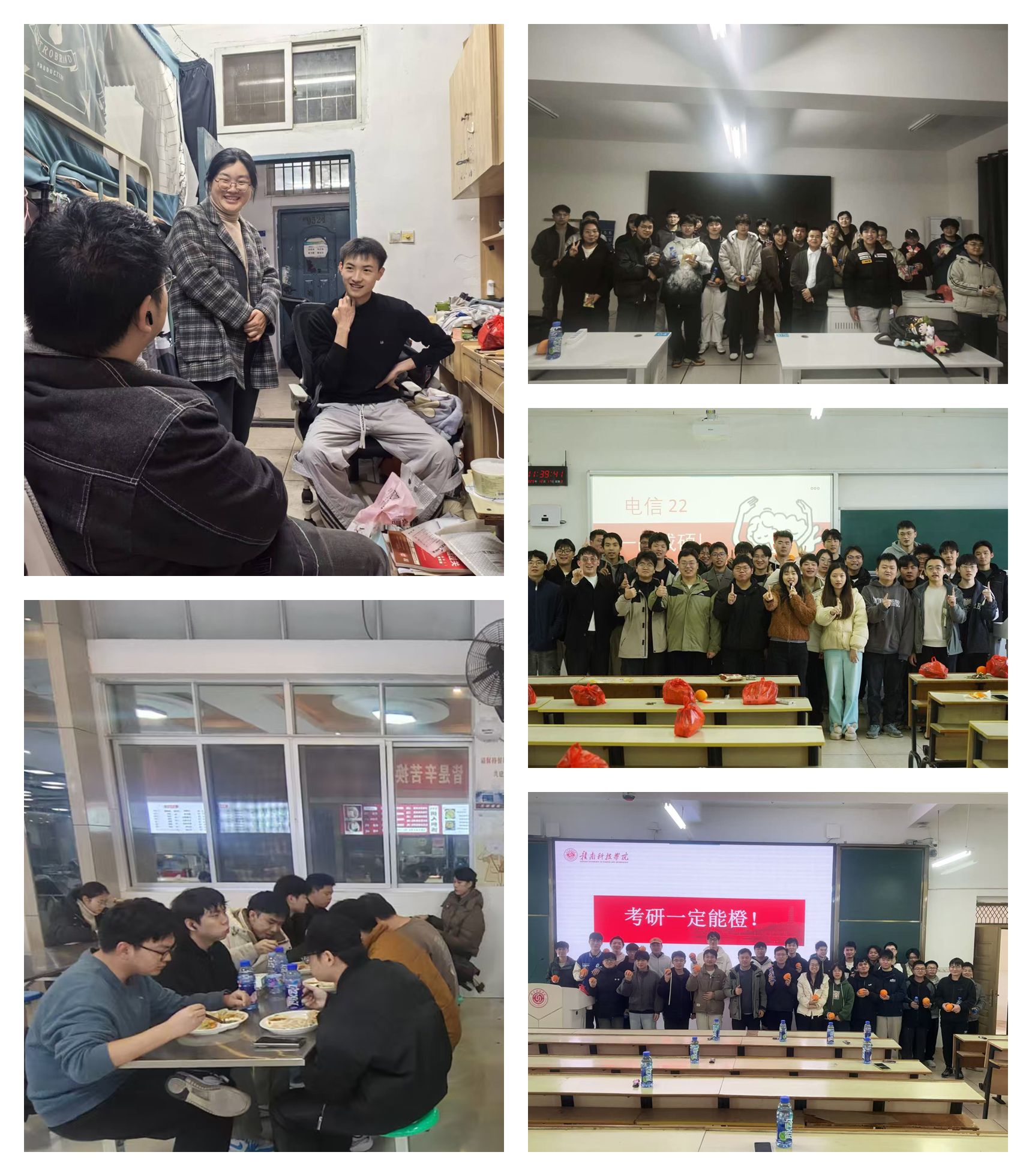 关怀不止于会议室,更延伸至学子们生活的每一个角落。在学生宿舍里,通信222班、大数据221班等班级的班主任与同学们促膝长谈,细致询问复习进度与食宿保障,一句句“注意防寒”“做好防护”的贴心话语,如春风化雨,悄然驱散了备考的焦虑。而在物联网221班、物联网222班的“暖心饺子宴”上,氤氲的热气中,师生们围坐在一起分享备考心得,家的味道温暖了疲惫的身心。电信221班、电信222班的班主任们,则亲手将寓意“一定橙”的脐橙和补充能量的零食送到每位学子手中,这份“橙”意满满的祝福,传递着最真挚的期许。除了生活上的关怀,学院更注重为学子们提供精准的学业与心理支持。多个毕业班级结合学科特点,召开考前加油会,班主任们倾囊相授冲刺技巧与心态调节方法,鼓励大家坚定信念、沉着应考。