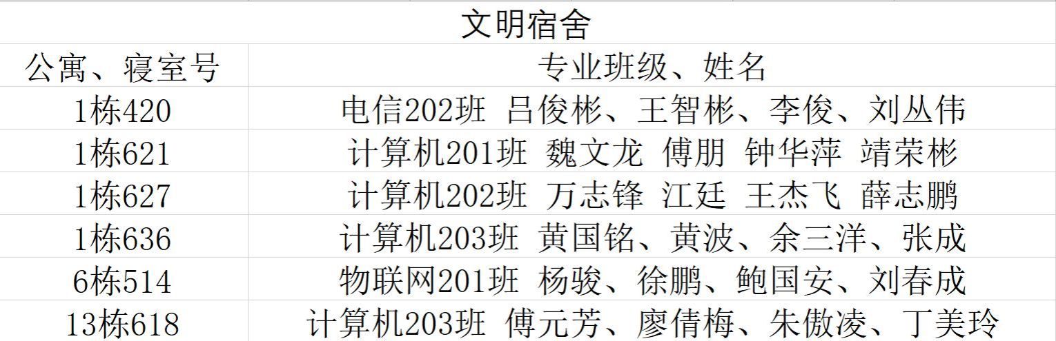 本网讯:为使学生有一个整洁、安静、和谐的学习和生活空间,同时营造良好的学习生活环境。经学生个人申请、班级评议、系部初审,信息工程系结合实际情况评选出以下文明宿舍。