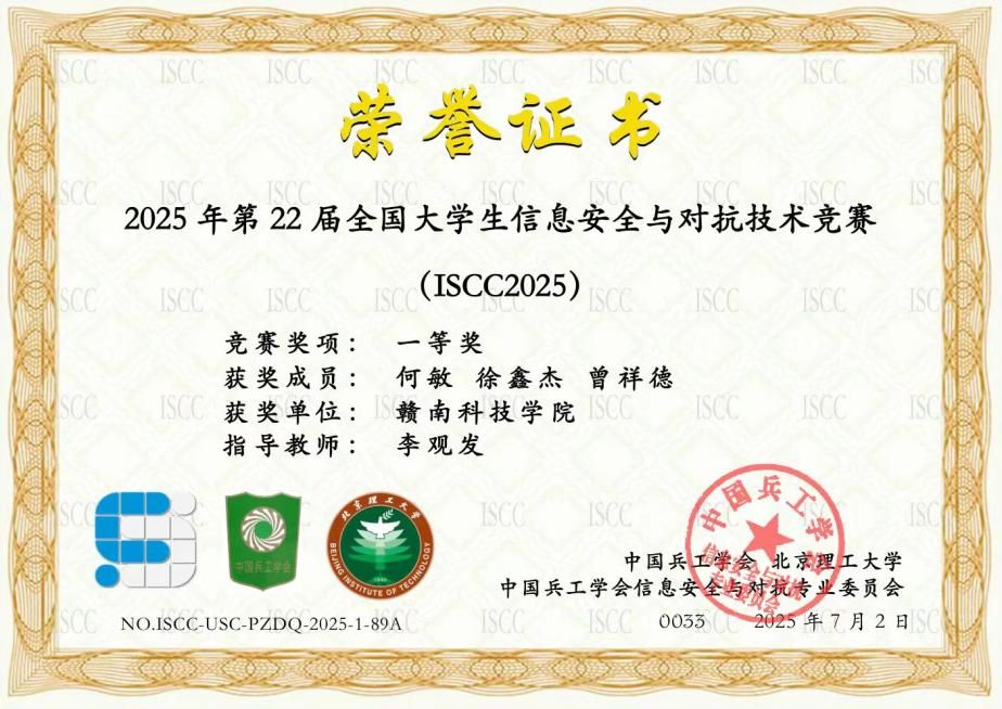 本网讯:7月14日,2025年第22届全国大学生信息安全与对抗技术竞赛(ISCC 2025)落下帷幕,米乐mile官网Undefin3d战队和Sup3rh3r0战队分别在破阵夺旗赛中分别荣获全国一等奖和全国二等奖,充分展现了米乐mile官网学子在信息安全领域的扎实功底和卓越实力。