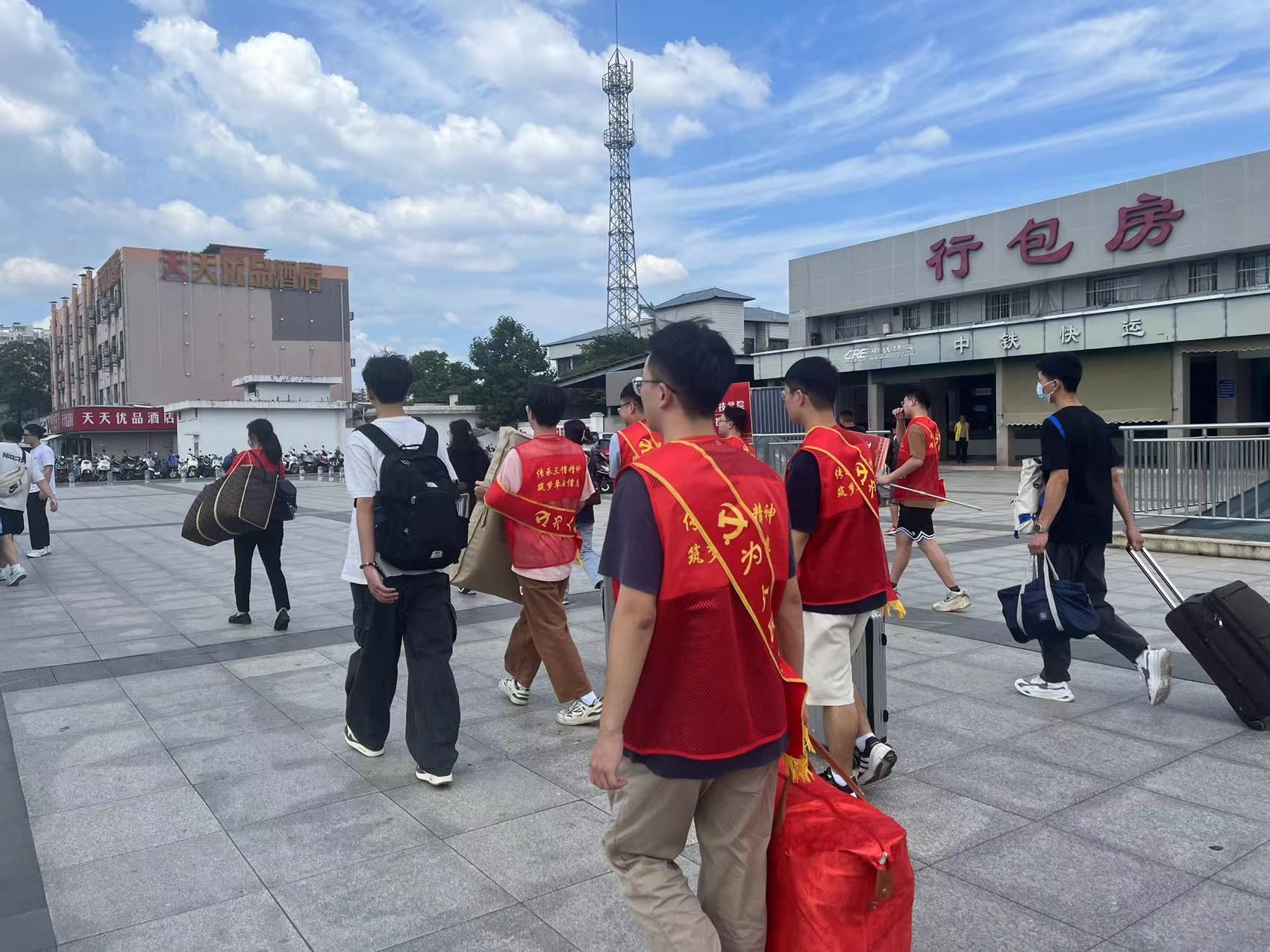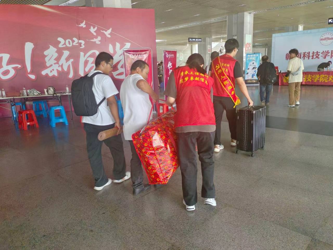 在车站迎新活动现场,举牌接站的支部同志在出站口迎接新生,并在新生出站时及时上前接待和搬运行李,引导新生到接待处进行个人信息登记后,分批次安排车辆接送新生到校报到。同时支部同志以亲切热情的态度为新生及家长细心解答疑惑,让新生及家长能够在到校前能更加了解学校。
