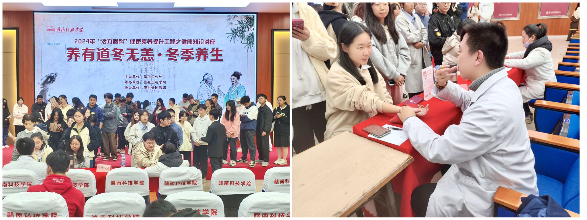 讲座伊始,肖丁榕医生围绕“冬季养生”这一主题,讲解了中医理论中的养生原则,肖医生的讲解深入浅出,用通俗易懂的言语向学生普及了饮食调养、起居作息、情志调节等方面的保健知识,赢得在场学生的阵阵掌声。随后,济世堂中医馆的医生团队为学生带来“体质辨识咨询”“中医特色疗法体验”“基础健康检测”等特色中医体验,现场同学们积极参加、反响热烈,纷纷表示收获满满,不仅学习到了实用养生知识,还感受到了传统中医诊疗的魅力。“这次讲座内容非常丰富,我不仅学习到了健康的养生理论知识,还免费体验到了中医专家的来校坐诊,中医专家给我的建议十分中肯实用。”来自物联网241班的张文彪接受完中医专家把脉问诊后如是说道。