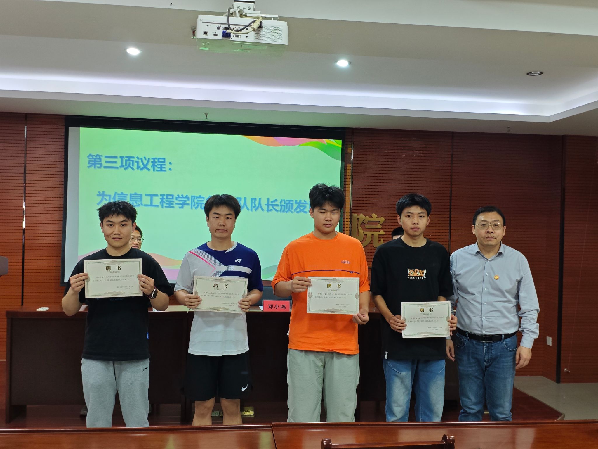 随后,进行了第一届活力信息体育文化节的颁奖仪式、球队队长聘书颁发仪式,运动员代表电信232班的陈兴同学上台发言。