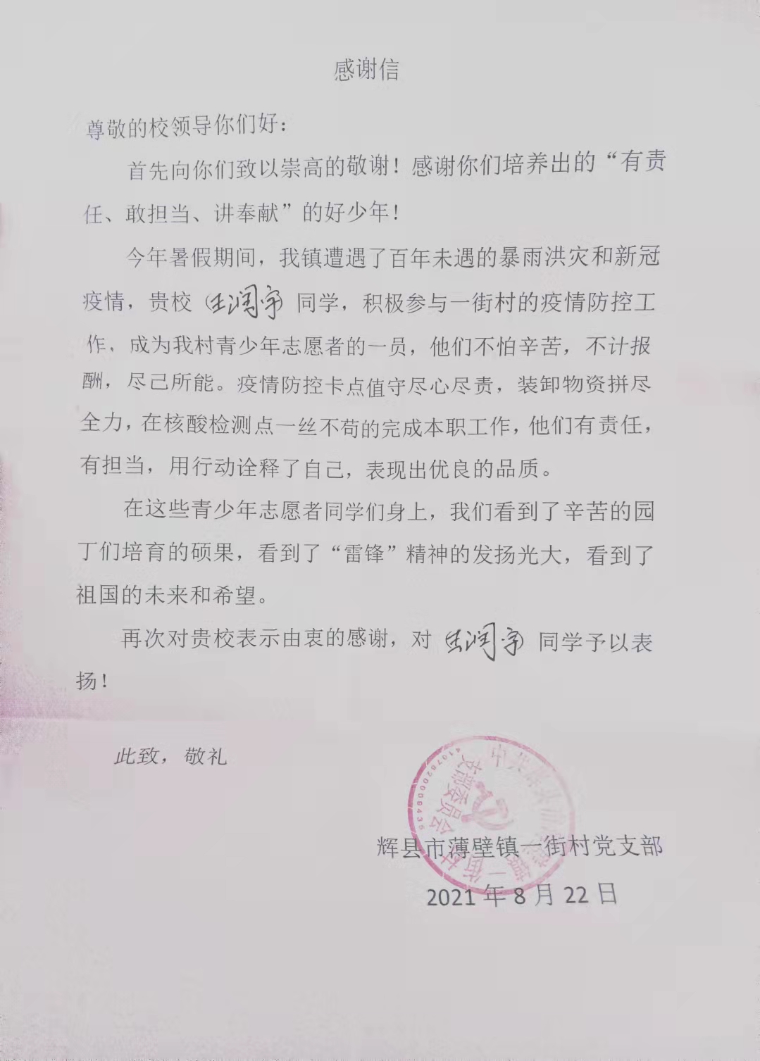 新冠肺炎疫情还未结束,突如其来特大暴雨又让辉县市薄壁县被洪水淹没,作为生长在这里的新一代青年,信息工程系计算机203班王润宇毅然决然的成为了一名志愿者,加入到薄壁县的防疫抗洪工作中。